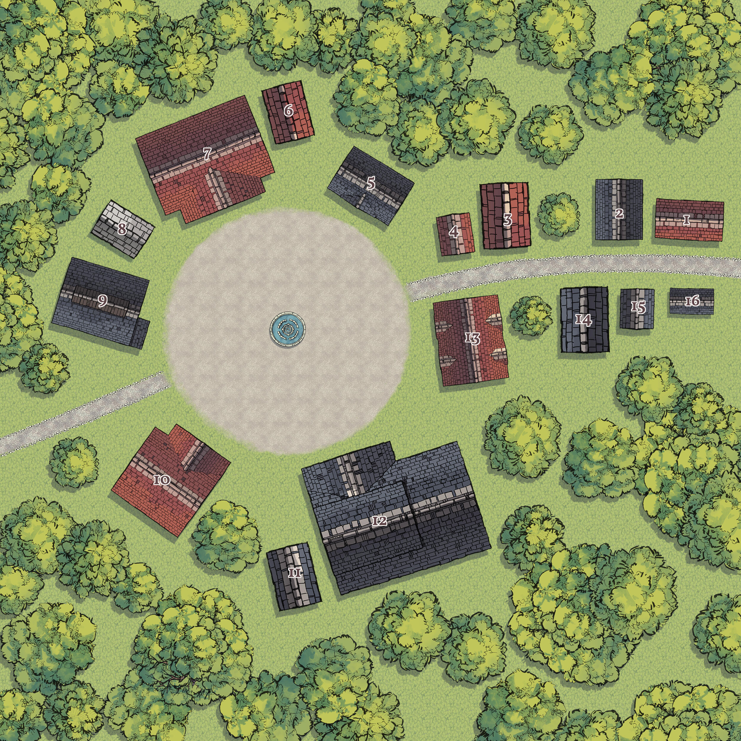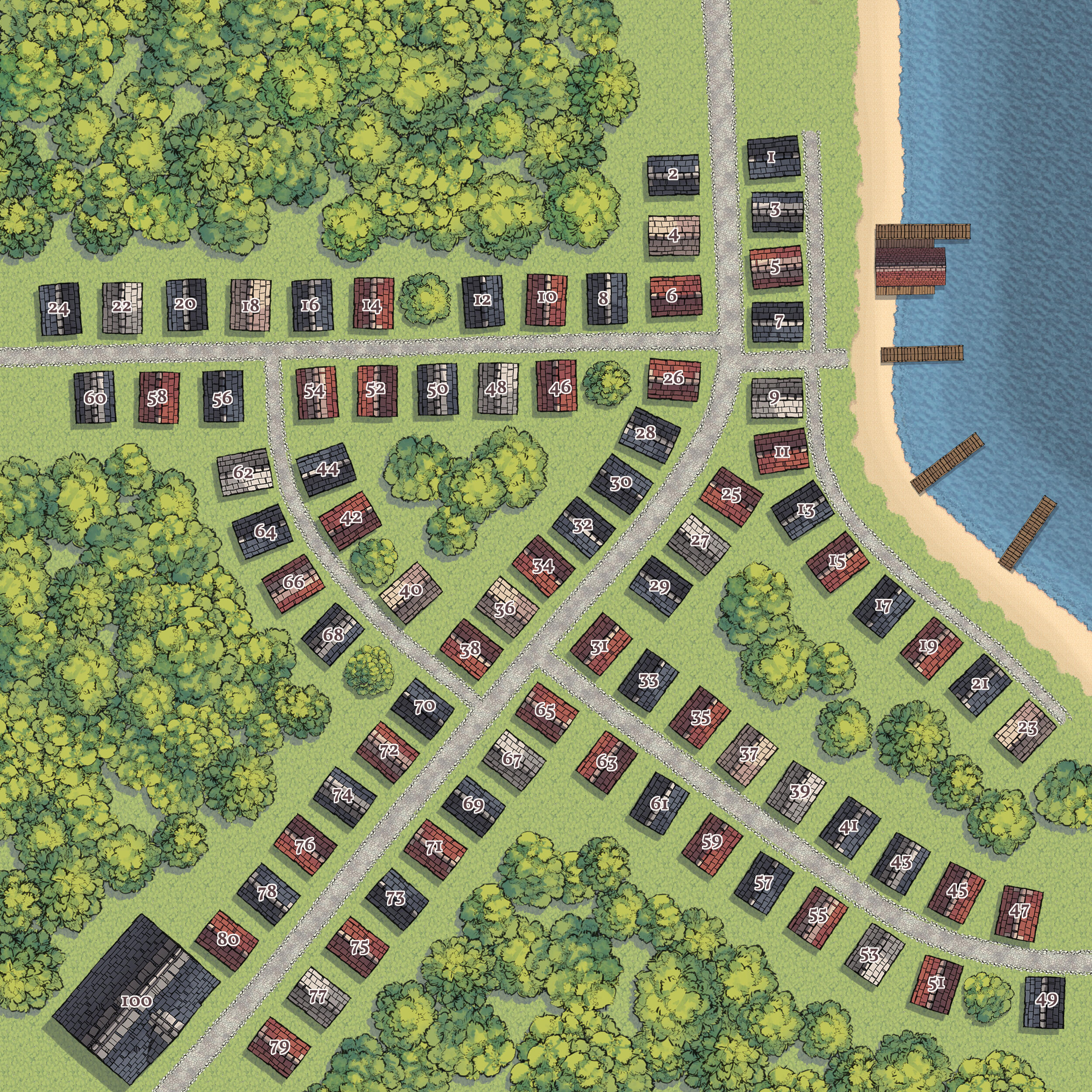 At first glance, Oakburrow hardly looks like a town at all. The landscape seems like a line of softly rising hills dotted with doorframes, stone archways, chimneys, and garden markers rather than visible houses. Most of the settlement is built into the hills themselves, with homes, inns, and workshops partly sunken into the earth, leaving only entrances and small windows above ground. The centre of Oakburrow is marked by a great old oak that forms the town’s main gathering and play space. Families often visit because the town is easy to navigate, the sheltered hill-homes feel safe for children to explore, and nearby fields, paths, and small community fairs offer plenty to do without needing to travel far.