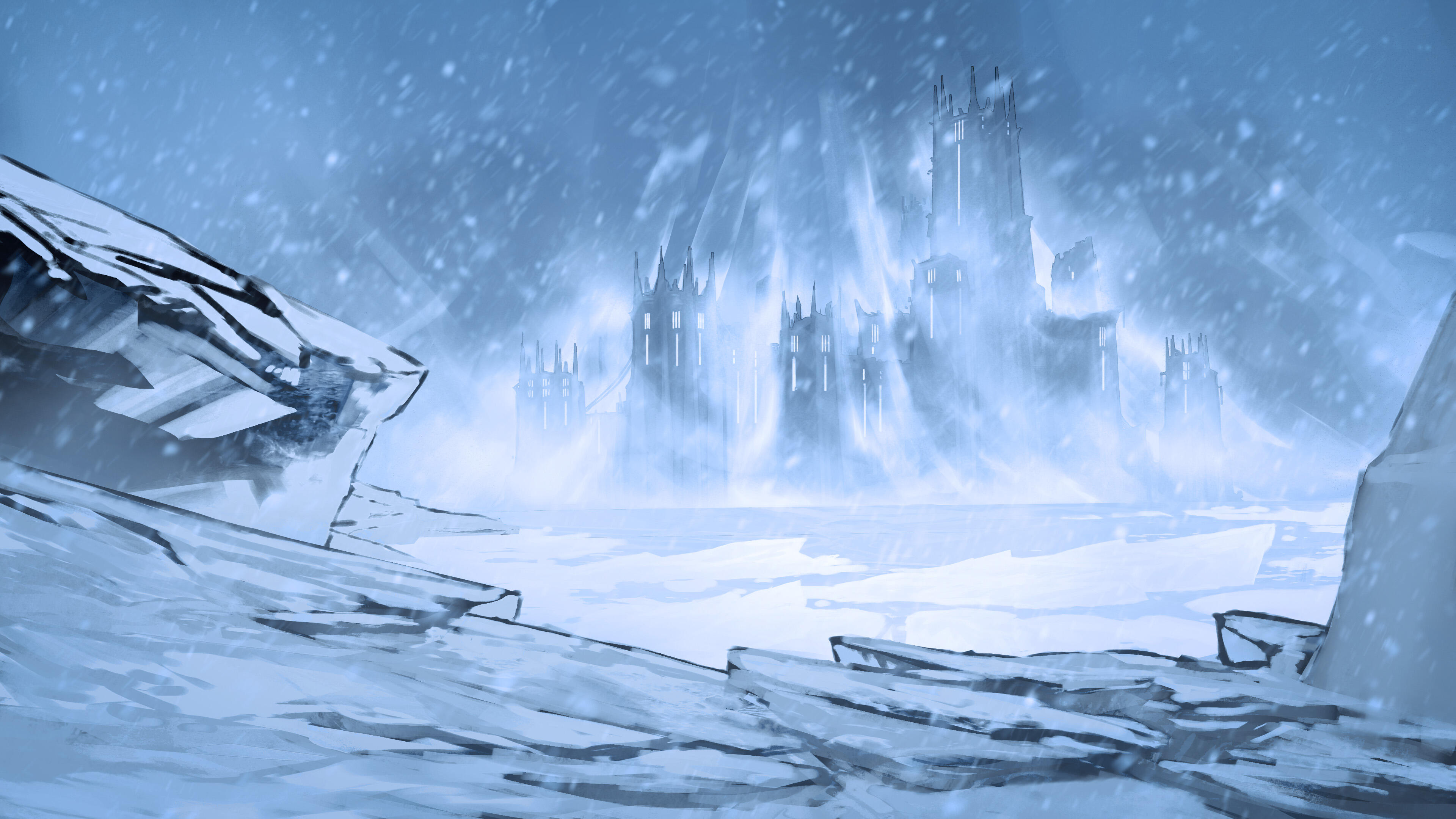 Moonfrost Cove sits along a relatively mild stretch of Frigoria’s coast, where sea winds soften the cold enough for long walks and outdoor gatherings to be possible without constant strain. The town is built around a massive coastal ice wall formed over centuries of pressure and sea spray, its surface laced with pale minerals and faint bioluminescent growths that make it glow softly in shifting blue and silver light at night. Lantern-lined walkways, evening gatherings, music, and small markets often centre around the illuminated ice. It has become especially popular with visitors who want to experience Frigoria’s winter atmosphere without facing its most severe conditions.