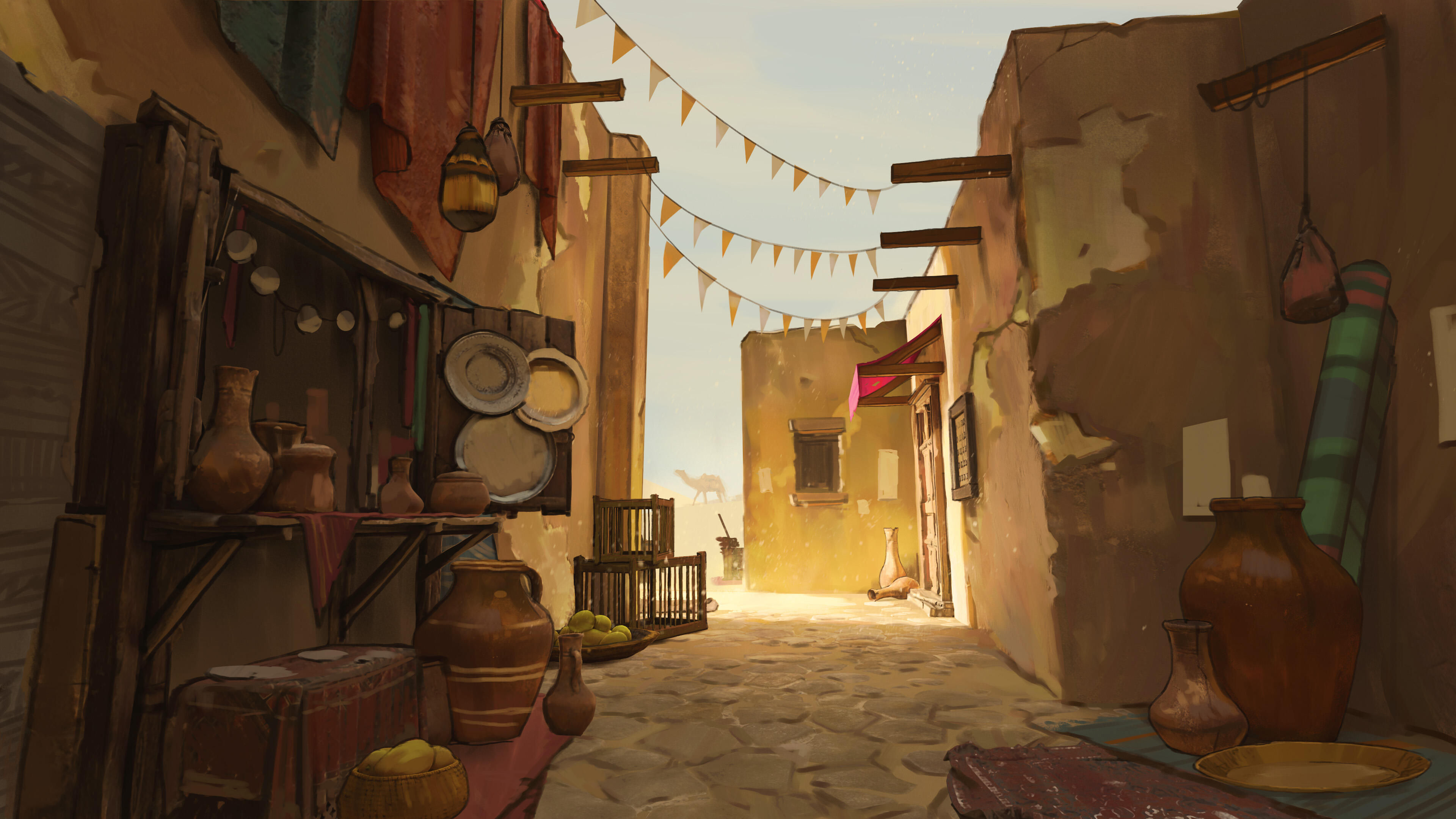 The city’s construction reflects its climate and function. Pale stone buildings, shaded streets, inner courtyards, and controlled access points help manage heat and movement, while major roads connect the palace district to caravan routes and coastal trade lines. Activity in Sunspire remains constant, driven by administration, commerce, and transport, with the city serving as the main point where inland routes, maritime trade, and regional authority converge.