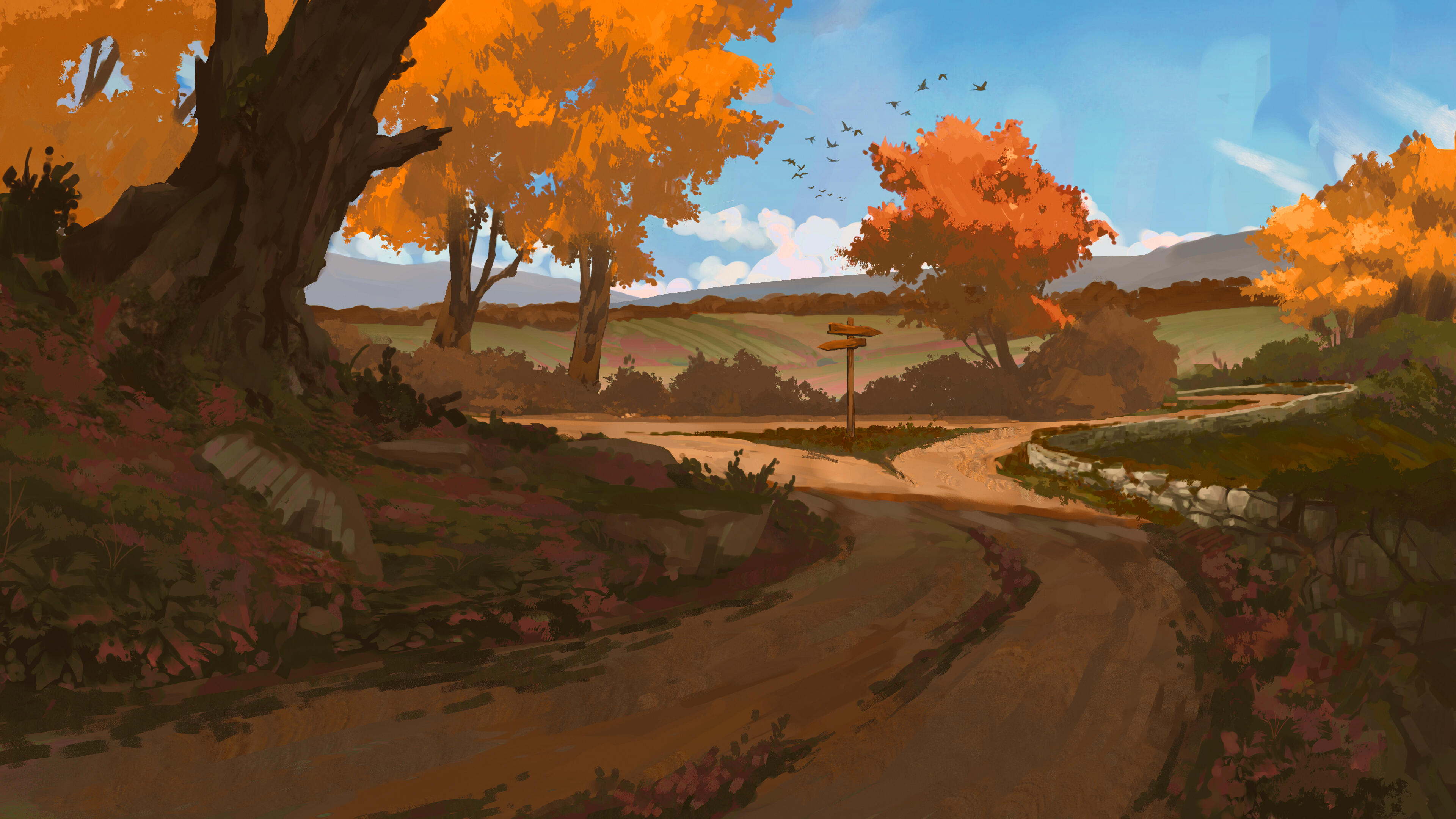 Gildenfall is a region of rolling hills, cultivated fields, forested slopes, and wide river plains, all held in warm autumn tones throughout the year. Farmland stretches across much of the countryside, broken by orchards, vineyards, woodland borders, and small villages spaced at regular intervals. Rivers and well-used trade roads link rural settlements to larger towns, while old stone bridges, mills, storehouses, and field boundaries mark places that have supported harvests and transport for generations.